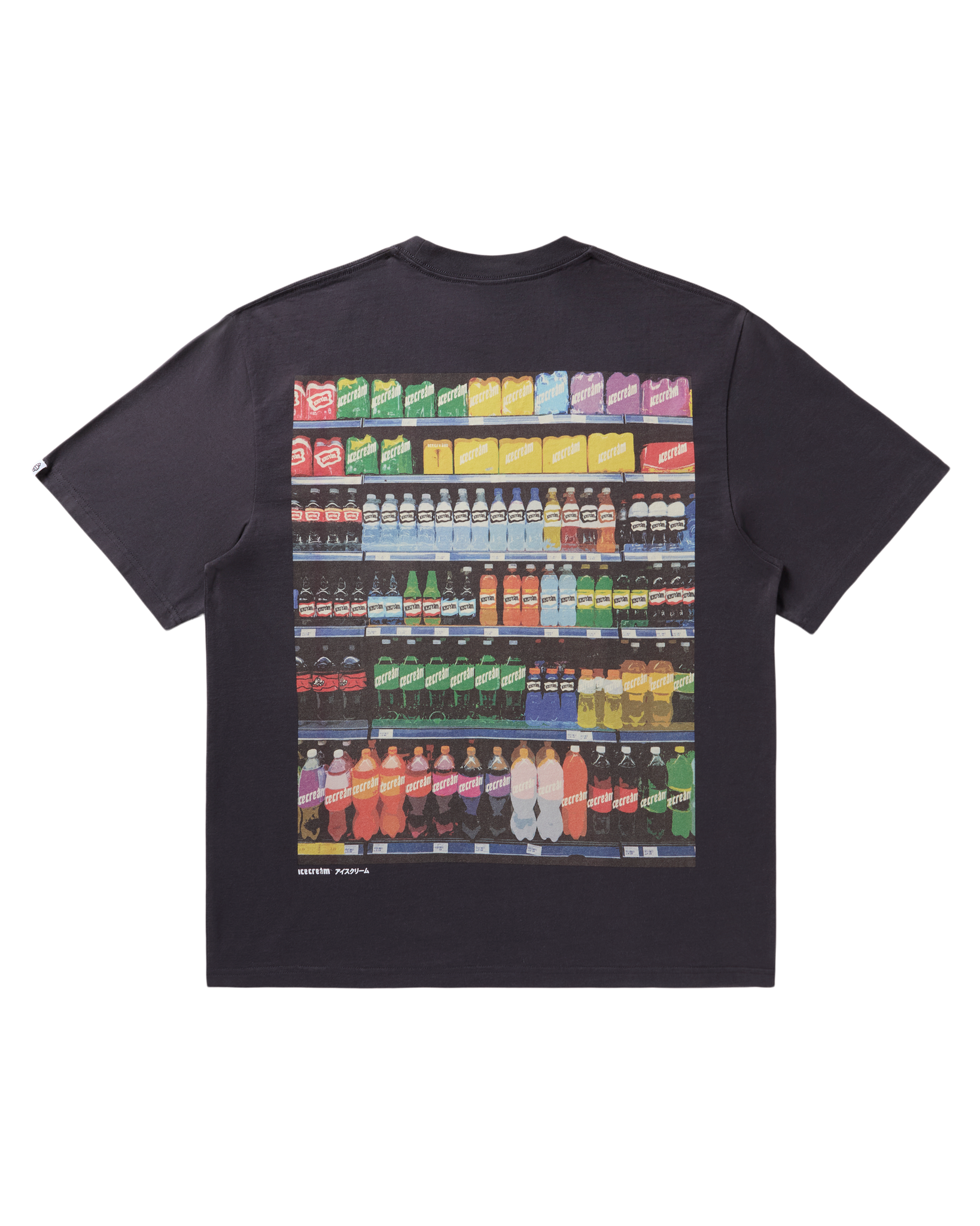Designed with a playful “Caution” sign graphic at the chest and a vibrant screen-printed convenience store drink aisle graphic at the back.