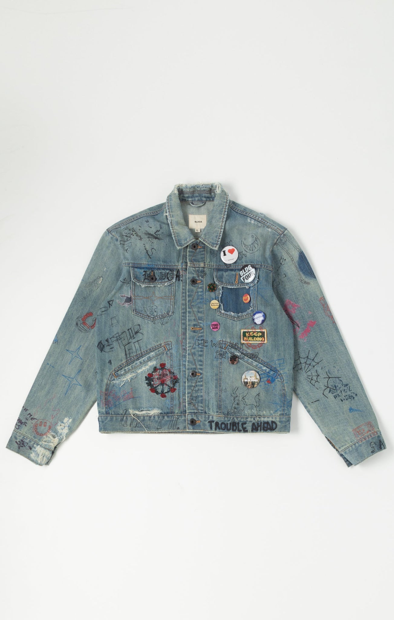 Distressed collar, pockets, and sleeve breaking